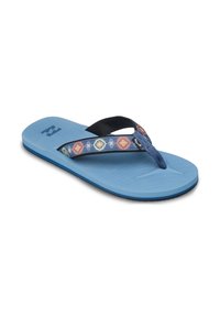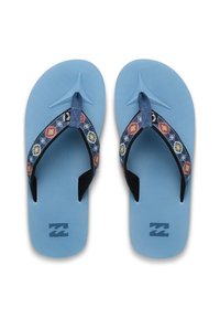 Niebieska japonka z paskiem ozdobionym wzorami kwiatowymi i geometrycznymi. Teksturowana, niebieska gumowa podeszwa z kontrastującym czarnym spodem.