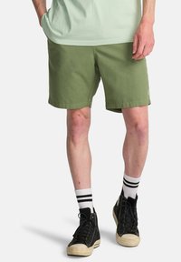 Mężczyzna ubrany w jasnooliwkowe spodenki, białe skarpetki z czarnymi paskami oraz czarne wysokie tenisówki, stojący z rękami w kieszeniach.