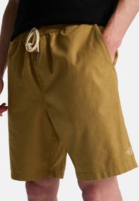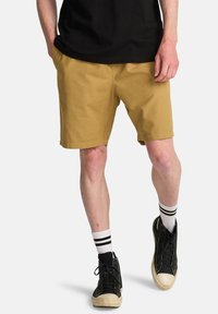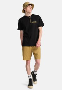 Krótkie spodenki khaki o prostym kroju, wykonane z bawełny, z bocznymi kieszeniami. Połączone z czarnymi trampkami za kostkę i białymi skarpetkami w paski.