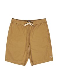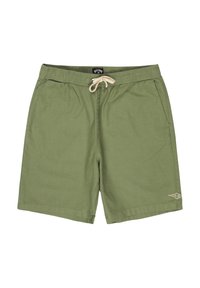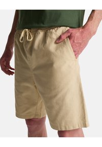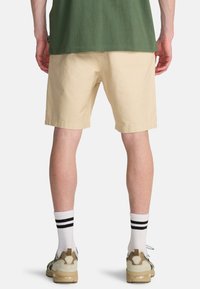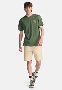 Beżowe szorty chino o luźnym kroju, z bocznymi kieszeniami i gładką fakturą, zestawione z zielonymi butami i białymi skarpetkami w paski.