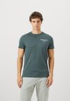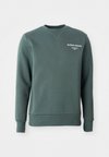 Młody mężczyzna z kręconymi włosami, ubrany w ciemnozieloną koszulkę Björn Borg i jasnoszare dresy, stoi na tle jednolitego białego tła.