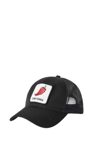 Niebieska czapka baseballowa z siatkowanymi bokami, ozdobiona kwadratową naszywką z żółtą gumową kaczką i napisem "DUCK IT!" w kolorze czarnym.