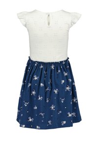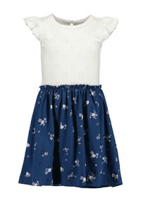Bawełniana sukienka z białą koronkową górą i granatową spódnicą w kwiaty. Posiada krótkie falbaniaste rękawy oraz elastyczną talię dla komfortu.