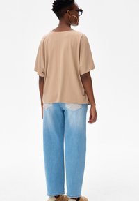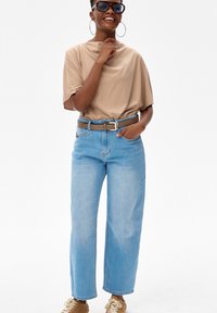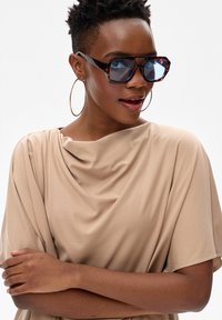 Kobieta w dużych niebieskich okularach przeciwsłonecznych, dużych kolczykach kołach, beżowej zwiewnej bluzce i jasnoniebieskich dżinsach, z założonymi ramionami, lekko się uśmiecha.