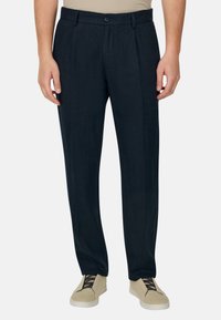 Mężczyzna w beżowych, dopasowanych spodniach i pasujących do nich trampkach z czarnymi sznurówkami, stojący na jednolitym tle.