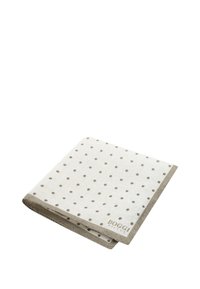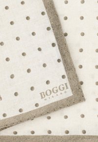 Kremowa kwadratowa chusteczka z małymi, równomiernie rozmieszczonymi kropkami w kolorze taupe oraz obramowaniem w tym samym kolorze, z logo "Boggi Milano" w rogu.
