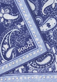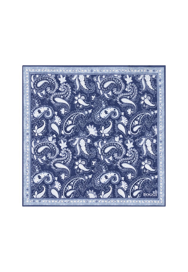 Kwadratowa chusta w niebiesko-biały wzór paisley z jasnoniebieską obwódką i drobnymi białymi kropkami, z logo "Boggi Milano" w rogu.