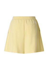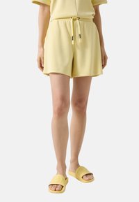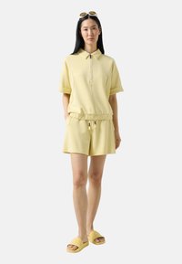 Osoba ubrana w bladoróżowe szorty ze ściągaczem i dopasowane klapki, stojąca na tle jednolitego, jasnego tła.