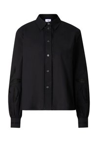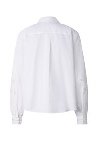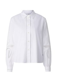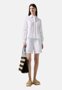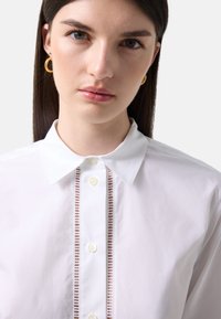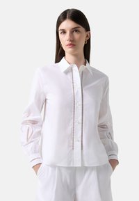 Kobieta ubrana w białą koszulę na guziki z koronkowymi wycięciami na rękawach i z przodu, ubrana w białe spodnie, stojąca na jednolitym tle.