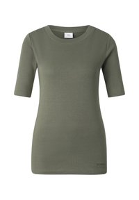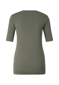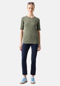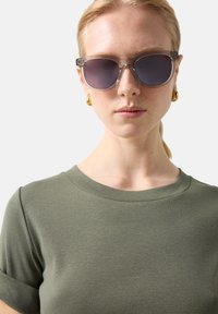 Młoda kobieta ubrana w oliwkowozielony top z krótkim rękawem, ciemnoniebieskie dżinsy, złote kolczyki koła i okulary przeciwsłoneczne spoczywające na jej głowie, stojąca na tle jednolitego tła.