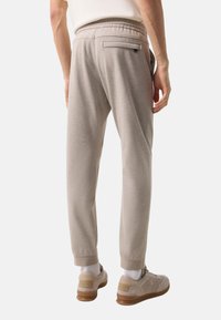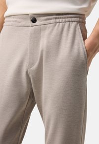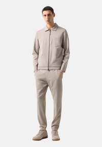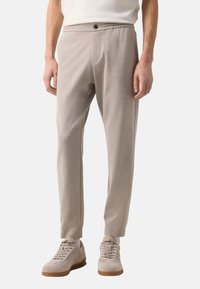 Mężczyzna ubrany w beżowe, dopasowane spodnie i beżowe sneakersy, stojący z rękami luźno opuszczonymi wzdłuż ciała.