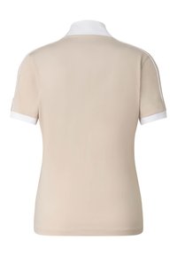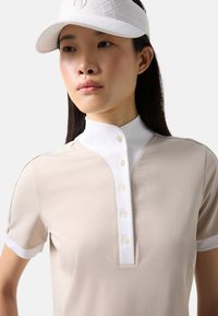 Kobieta ubrana w beżową koszulkę polo z krótkim rękawem, z czarno-białym wzorzystym wysokim kołnierzem oraz pasujące beżowe krótkie spodenki, stojąca prosto.