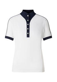 Biała koszulka polo z klasycznym kołnierzykiem, listwą guzikową i okrągłą niebieską naszywką na piersi. Krótkie rękawy i luźny krój.