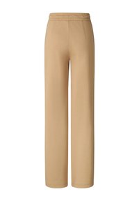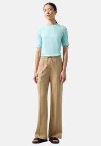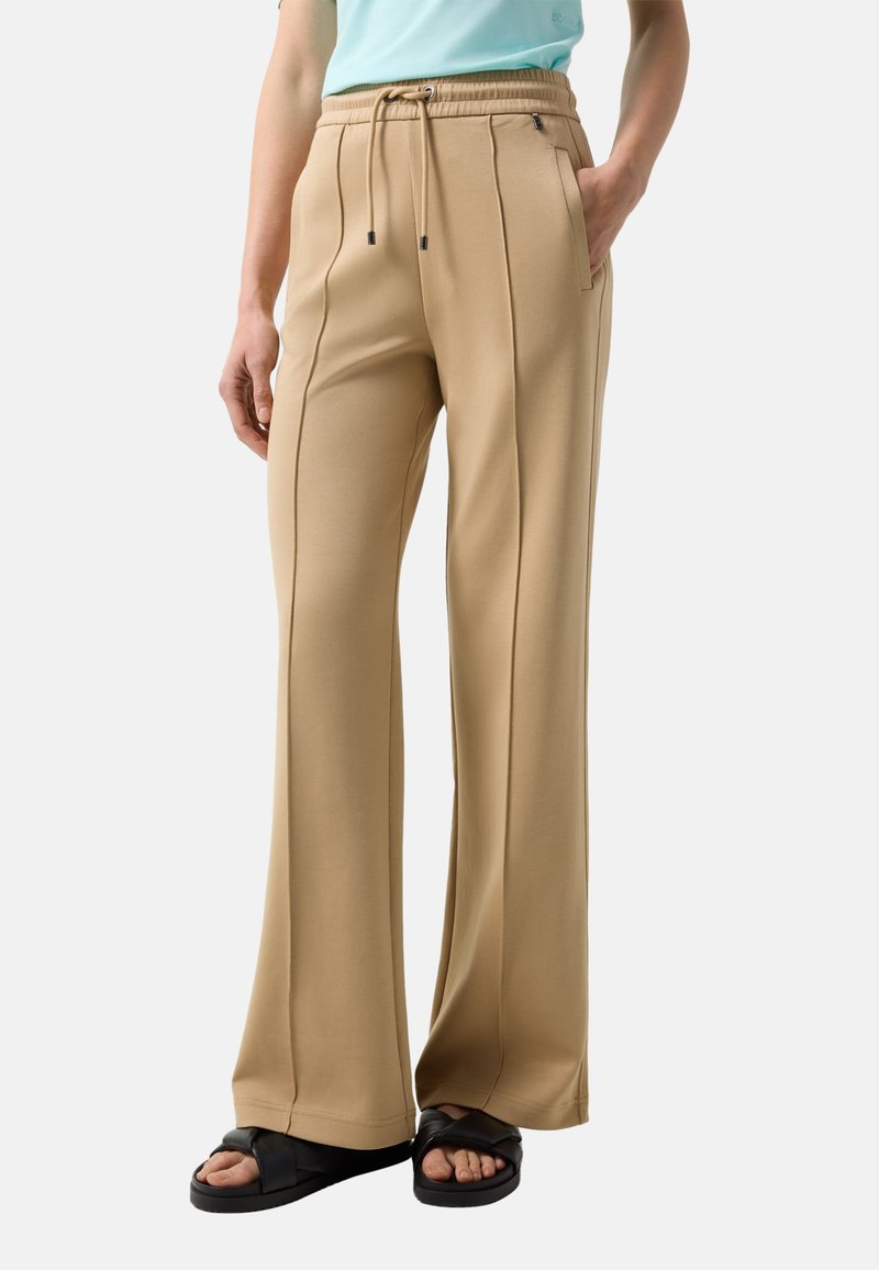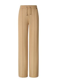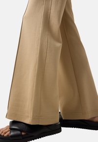 Osoba nosząca beżowe spodnie o szerokich nogawkach z przednimi szwami, elastycznym pasem z sznurkiem, kieszeniami po bokach oraz czarne sandały z plecionymi paskami.