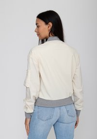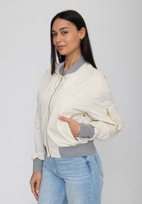 Kobieta o długich ciemnych włosach nosi kremową kurtkę bomberkę z szarymi mankietami i kołnierzem, jasnoniebieskie dżinsy oraz małe złote kolczyki kółka.