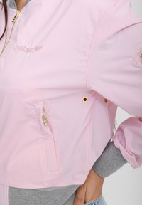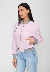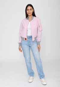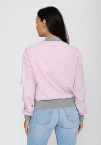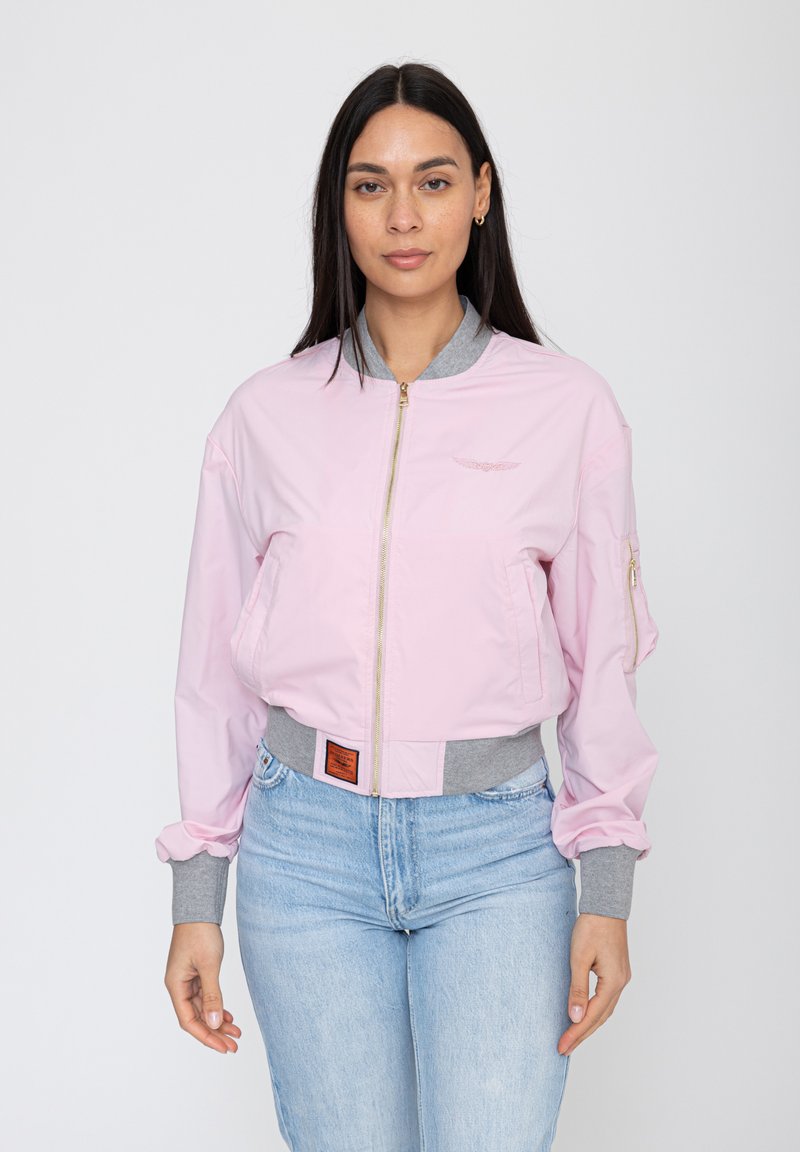 Kobieta o długich ciemnych włosach, ubrana w jasnoróżową kurtkę bomber z szarymi mankietami i kołnierzem, w połączeniu z jasnoniebieskimi dżinsami, stojąca na białym tle.