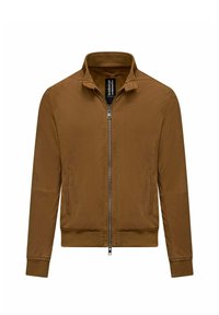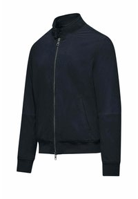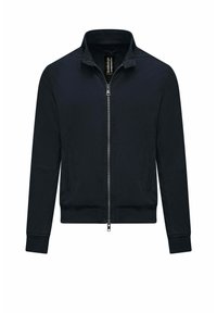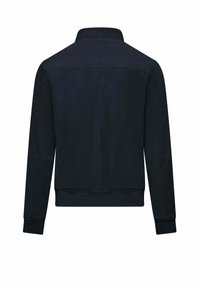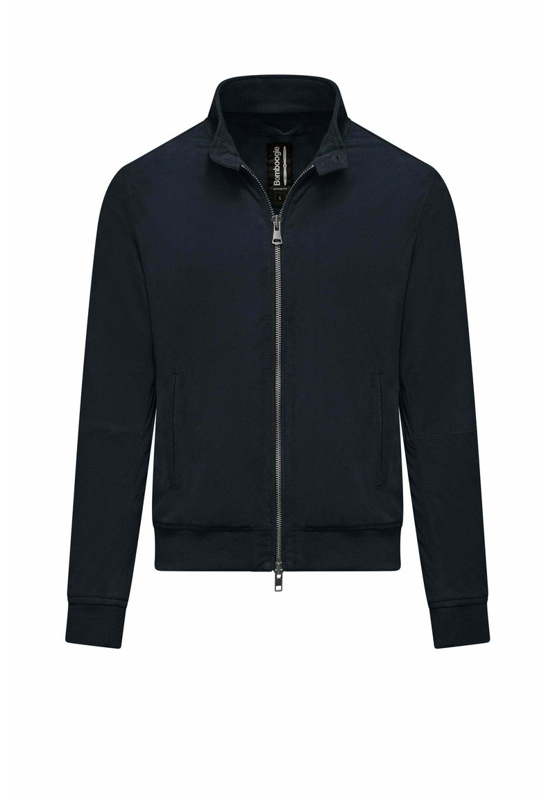 Czarna kurtka na suwak z kołnierzem typu stójka, ściągaczami na mankietach i dole, przednimi kieszeniami oraz metalowym zamkiem błyskawicznym, przedstawiona na białym tle.