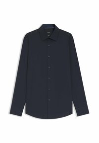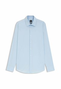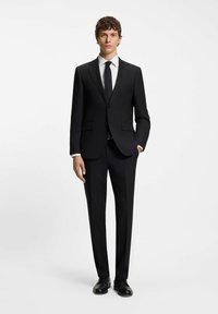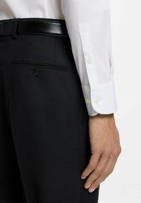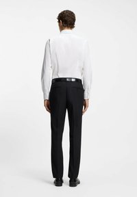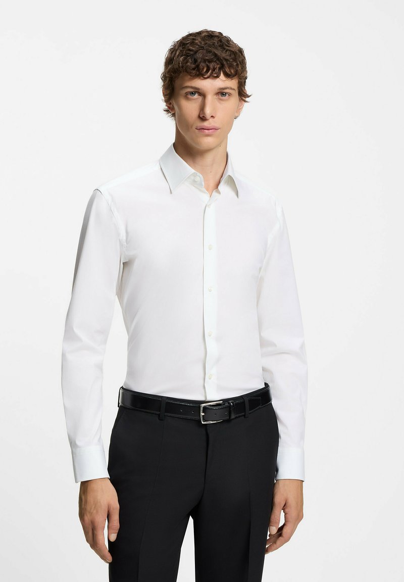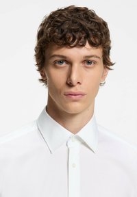 Biała koszula na długi rękaw, zapinana na guziki, z kołnierzem na ostro, noszona z czarnymi spodniami i czarnym paskiem. Gładki materiał, dopasowany krój.