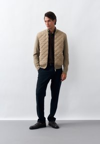 Mężczyzna w pikowanej jasnobrązowej kurtce z dzianinowymi rękawami, pod którą ma ciemnobrązową koszulkę polo, oraz w granatowych spodniach, stoi na tle jednolitego białego tła.