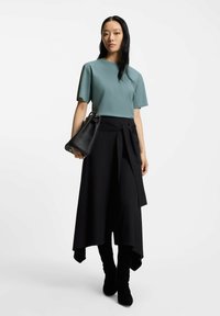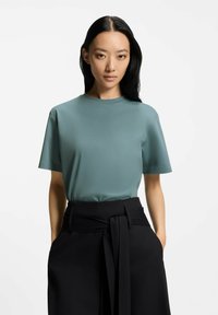 Koszulka z krótkim rękawem i okrągłym dekoltem w stonowanym morskim kolorze, o gładkiej fakturze, zestawiona z czarnymi spodniami z wysokim stanem i wiązaniem w talii.