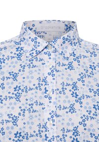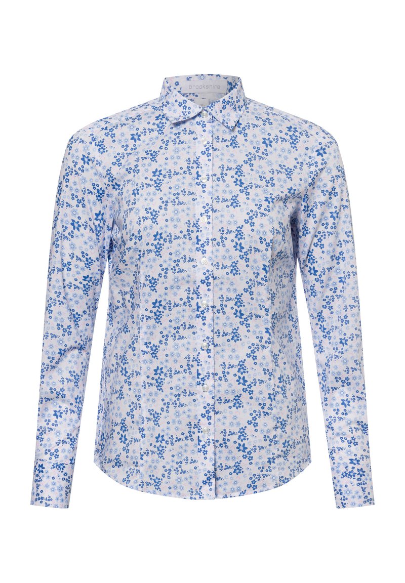 Biała koszula z długim rękawem z niebieskim wzorem kwiatowym. Wykonana z lekkiego materiału, z klasycznym kołnierzykiem i prostym dołem.