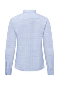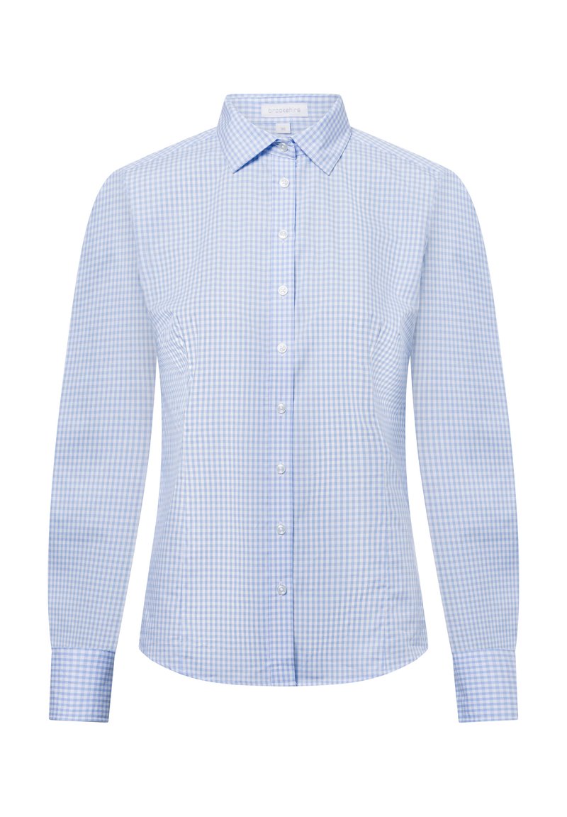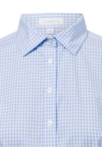 Jasnoniebieska koszula w kratkę wykonaną z bawełny, z kołnierzykiem zapinanym na guziki, długimi rękawami i dopasowanym krojem o gładkiej fakturze.