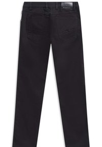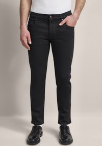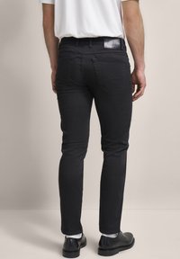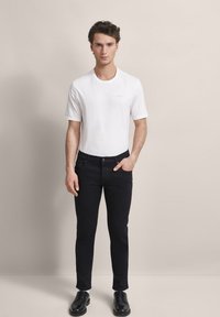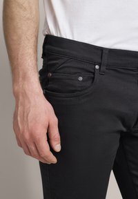 Czarne dżinsy o slim fit, z klasycznym pięciopocketowym fasonem, czerwoną akcentującą guzik oraz gładką teksturą. W połączeniu z czarnymi butami.