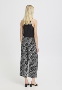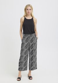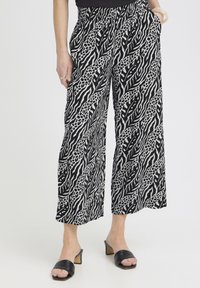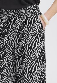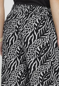 Czarno-białe spodnie o szerokich nogawkach z abstrakcyjnym wzorem zwierzęcym, noszone z czarnymi klapkami na obcasie z odkrytymi palcami i czarną bluzką.