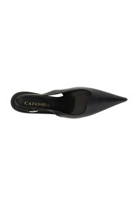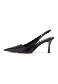 Czarny skórzany but na obcasie w kształcie szpica, z paskiem na piętę oraz regulowanym paskiem z klamrą na wysokości śródstopia.
