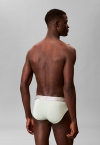 Muskularny mężczyzna stojący boso z założonymi ramionami, ubrany w jasne majtki na jednolitym szarym tle.
