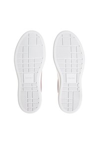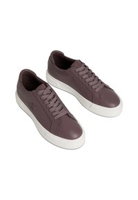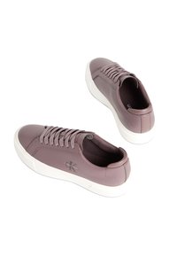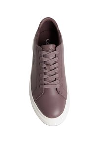 Niski mauve skórzany sneaker z grubą białą podeszwą, sznurowanym przodem oraz wytłoczonym logo Calvin Klein po bokach.