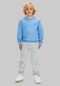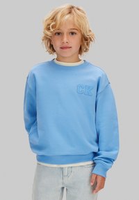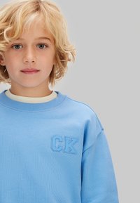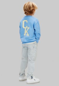 Blond dziecko stojące, ubrane w jasnoniebieską bluzę z literami "CK", jasne wyprane dżinsy, białe trampki, na jednolitym szarym tle.