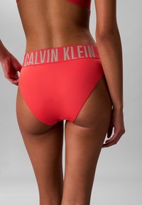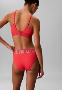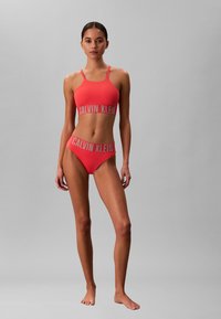 Kobieta ubrana w koralowe bikini Calvin Klein z szerokim paskiem z logo, trzymająca boki majtek.