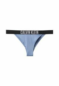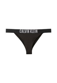 Młoda kobieta w czarnym staniku i majtkach marki Calvin Klein stoi na jednolitym szarym tle.