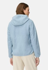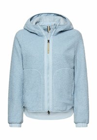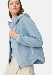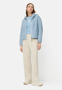 Kobieta w jasnoniebieskiej bluzie polarowej z kapturem na zamek, z rękami w kieszeniach, w beżowych spodniach, stojąca na jednolitym tle.