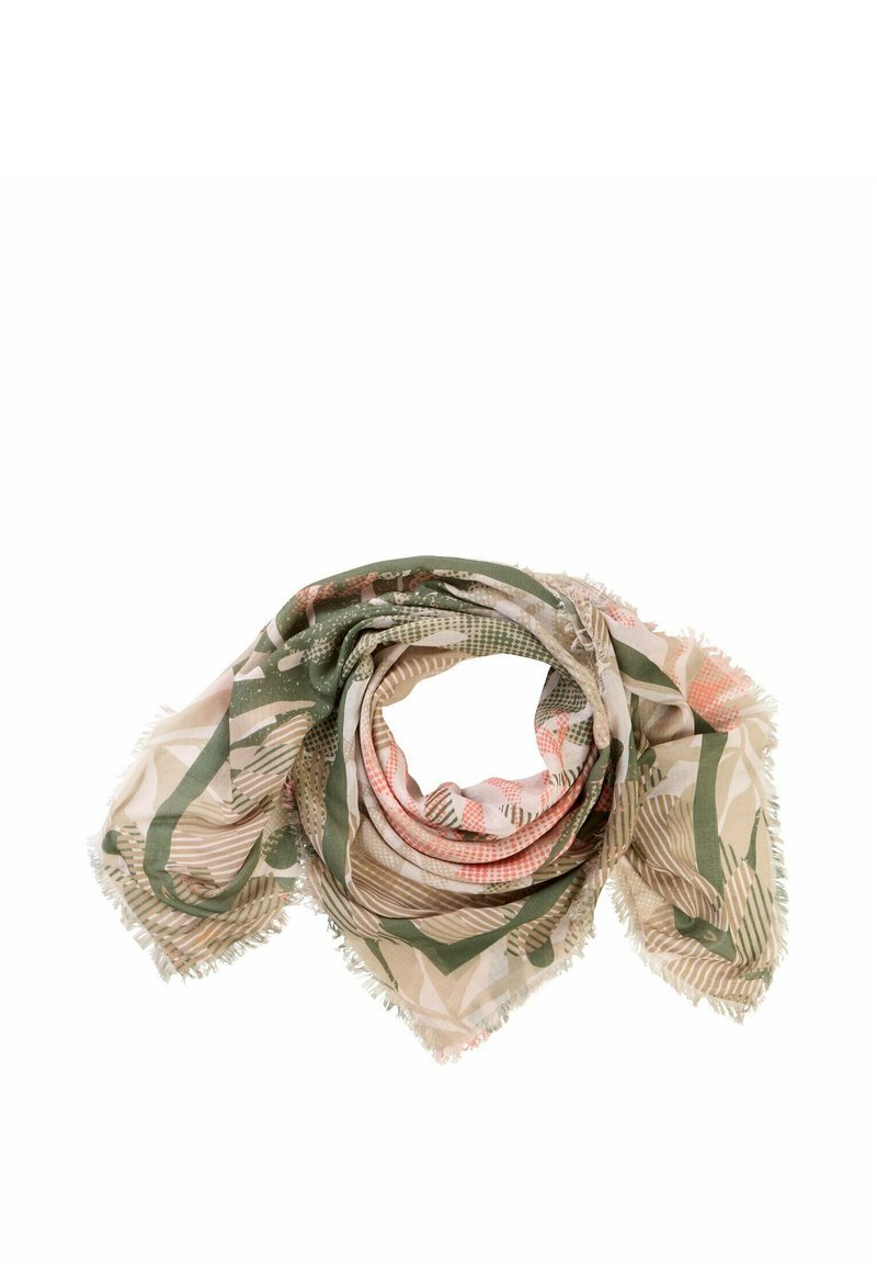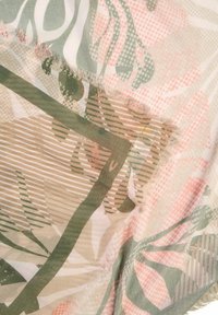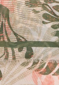 Lekki szalik z wzorzystej tkaniny z abstrakcyjnymi liśćmi w kolorze zielonym, beżowym i różowym, luźno zwinięty z frędzlowanymi krawędziami na białym tle.