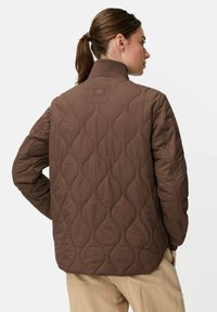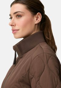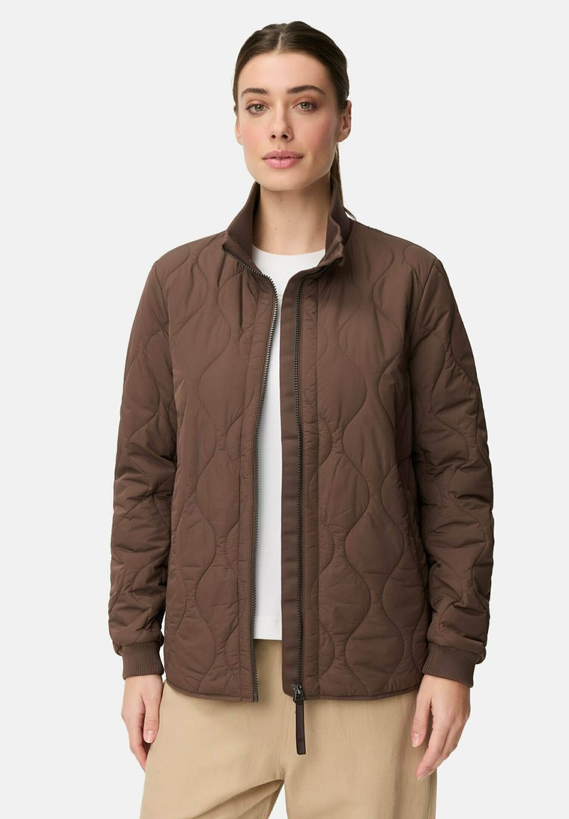 Kobieta ubrana w brązową, pikowaną kurtkę na białym topie i beżowe spodnie, zwrócona przodem z neutralnym wyrazem twarzy na tle jednolitego tła.