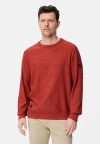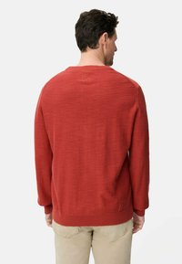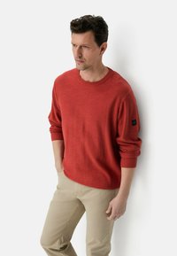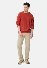 Mężczyzna w rdzawoczerwonym swetrze z długim rękawem i beżowych spodniach stojący na tle jednolitego jasnego tła.