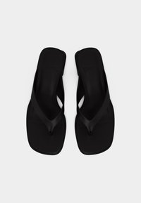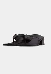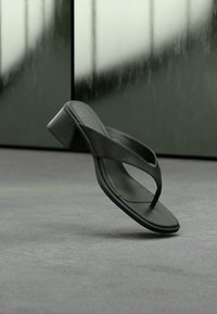 Czarna sandałka na obcasie typu thong z szerokimi paskami uniesiona nad szarym dywanem i ciemnym, rozmytym tłem paneli.