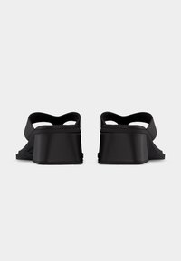 Czarna koturnowa sandała na platformie z teksturowaną wkładką i cienkimi paskami z subtelnym logo na jednolitym białym tle.