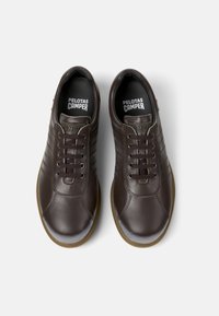 Brązowy skórzany sneaker z tonowanymi paskami, zaokrąglonym noskiem i beżową gumową podeszwą z teksturowanym bieżnikiem. Sznurowany, z sześcioma oczkami.