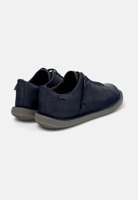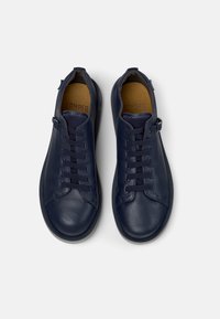 Granatowy skórzany sneaker z zaokrąglonym noskiem, teksturowaną powierzchnią, smukłym profilem i kontrastową szarą podeszwą. Wyposażony w sznurowanie oraz boczny pasek ozdobny.