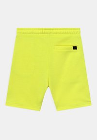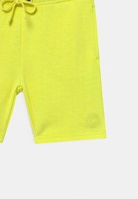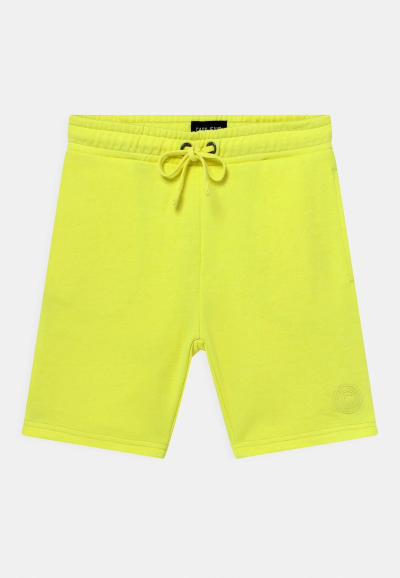 Jasnożółte szorty z elastycznym pasem, sznurkiem z przodu i bocznymi kieszeniami, z małym haftowanym logo w pobliżu dołu.