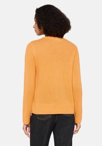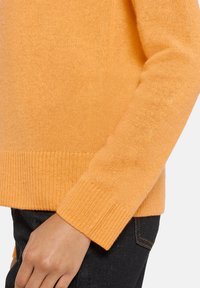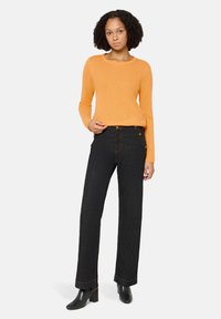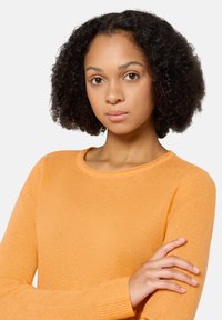 Pomarańczowy sweter dziany z okrągłym dekoltem, długimi rękawami, teksturowaną tkaniną i lekko dopasowanym dołem, zestawiony z ciemnymi jeansami.
