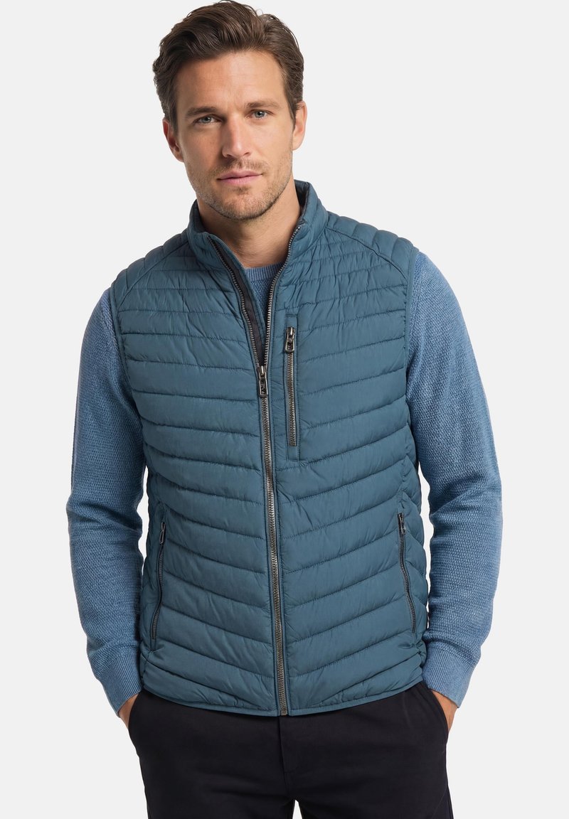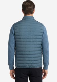 Mężczyzna o jasnobrązowych włosach, ubrany w niebieską pikowaną kamizelkę na niebieskim swetrze, stojący z rękami w kieszeniach na jednolitym tle.