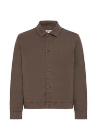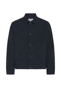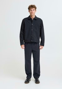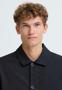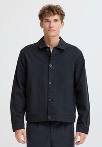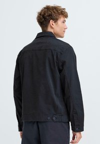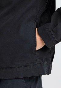Czarna bawełniana kurtka z zapięciem na guziki i wąskim kołnierzem, o luźnym kroju i długich rękawach. Materiał o fakturze z widocznym przeszyciem.
