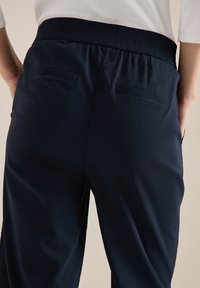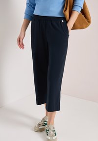 Osoba w granatowych spodniach 7/8, niebieskiej bluzce z długim rękawem, beżowych sneakersach z zielonymi akcentami i z brązową zamszową torbą na ramieniu.