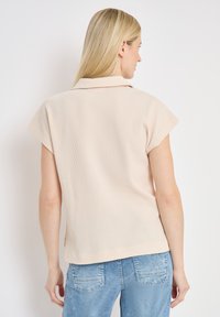 Blondynka w beżowej krótkim rękawem z kołnierzykiem, niebieskich dżinsach i jasnoniebieskiej czapce z daszkiem, stojąca z jedną ręką w kieszeni.