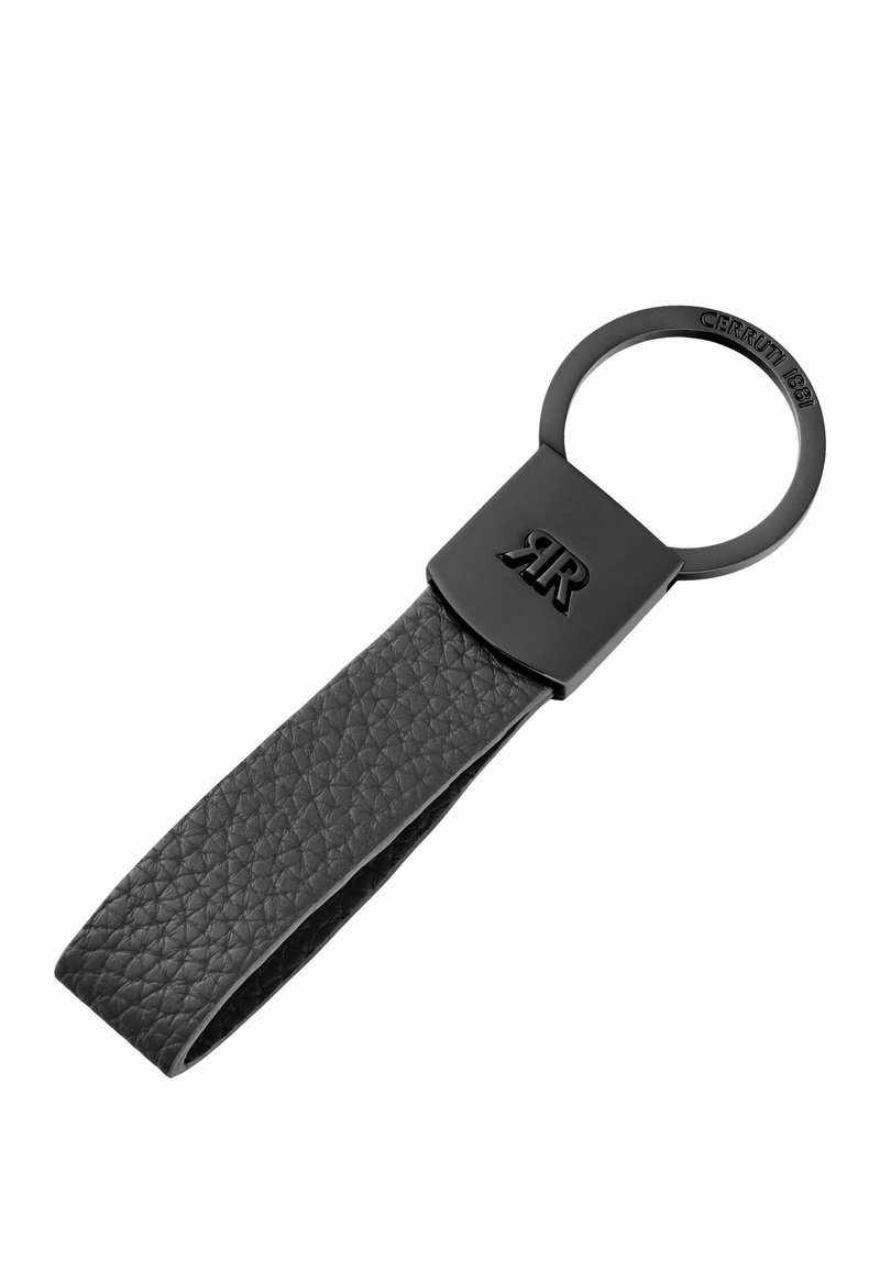 Czarna skórzana pętelka na klucze z teksturowanym paskiem, matowym czarnym metalowym kółkiem oraz kwadratowym łącznikiem z grawerem "RR" i "CERRUTI 1881".