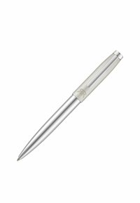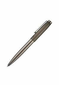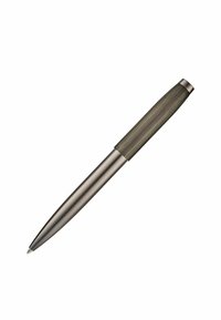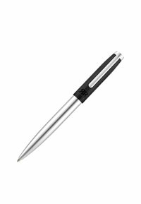 Elegancki metaliczny długopis kulkowy z satynowym wykończeniem, ciemną górną częścią, klipsem oraz wygrawerowanym logo w pobliżu nasadki.